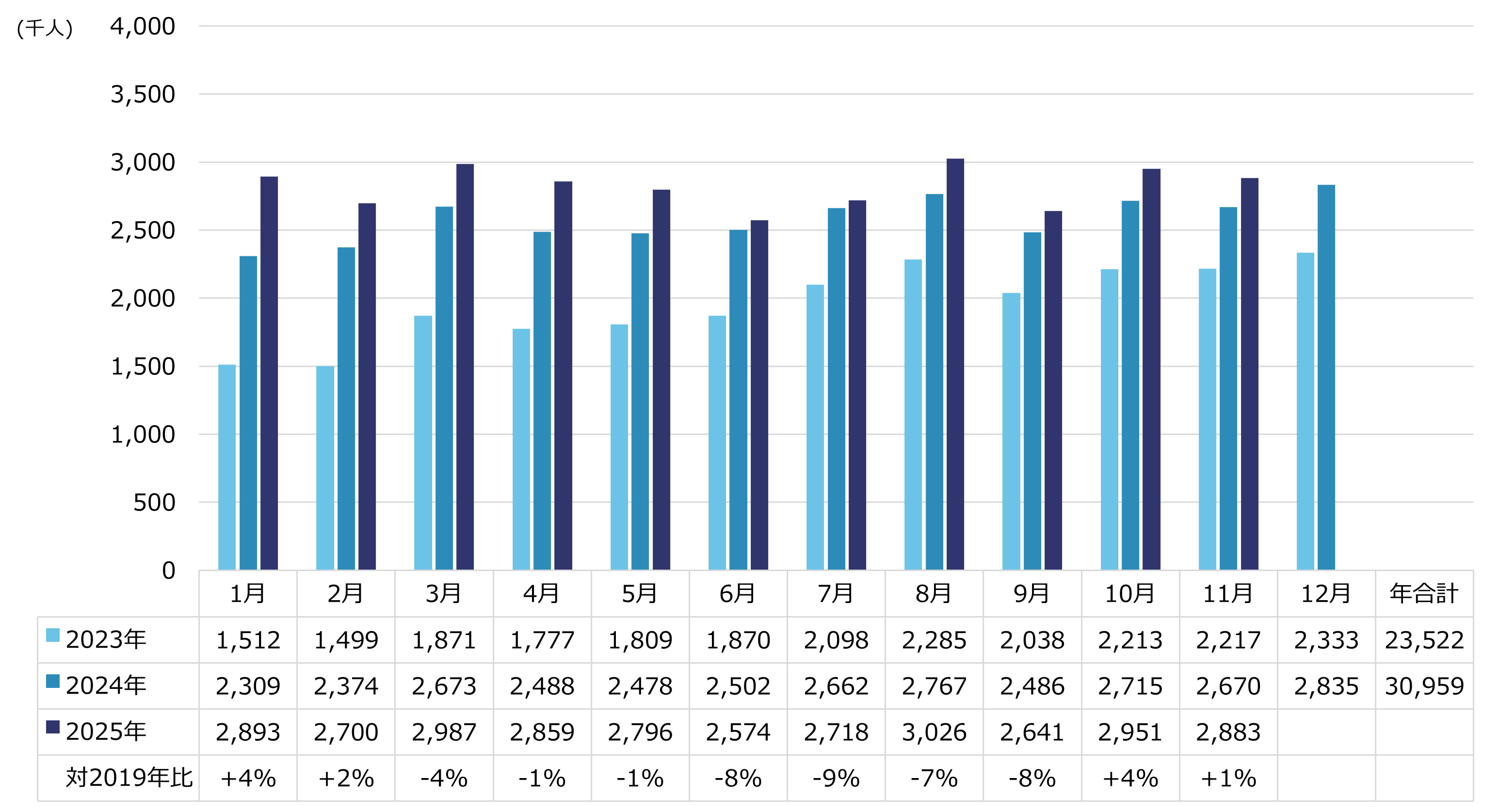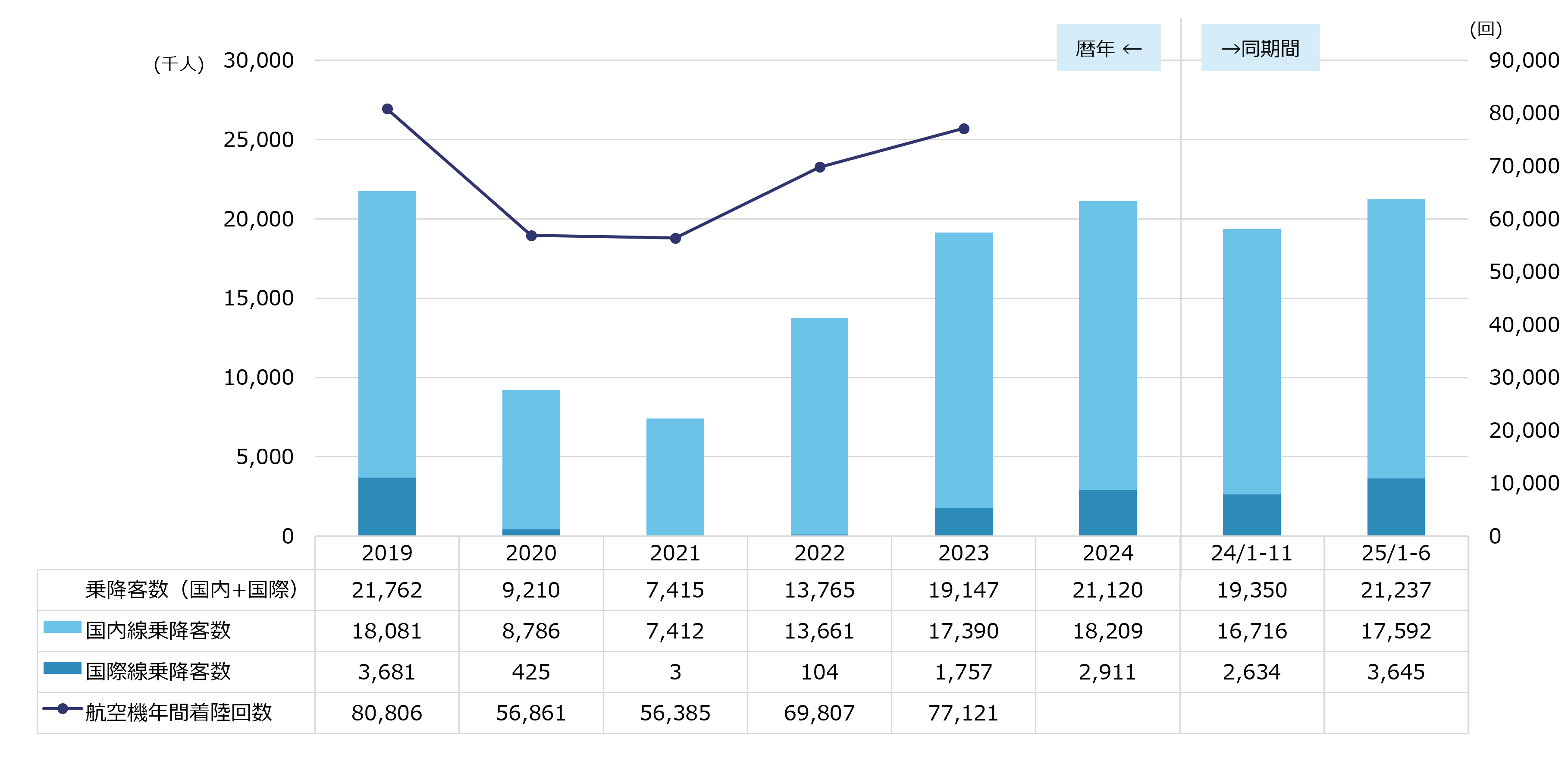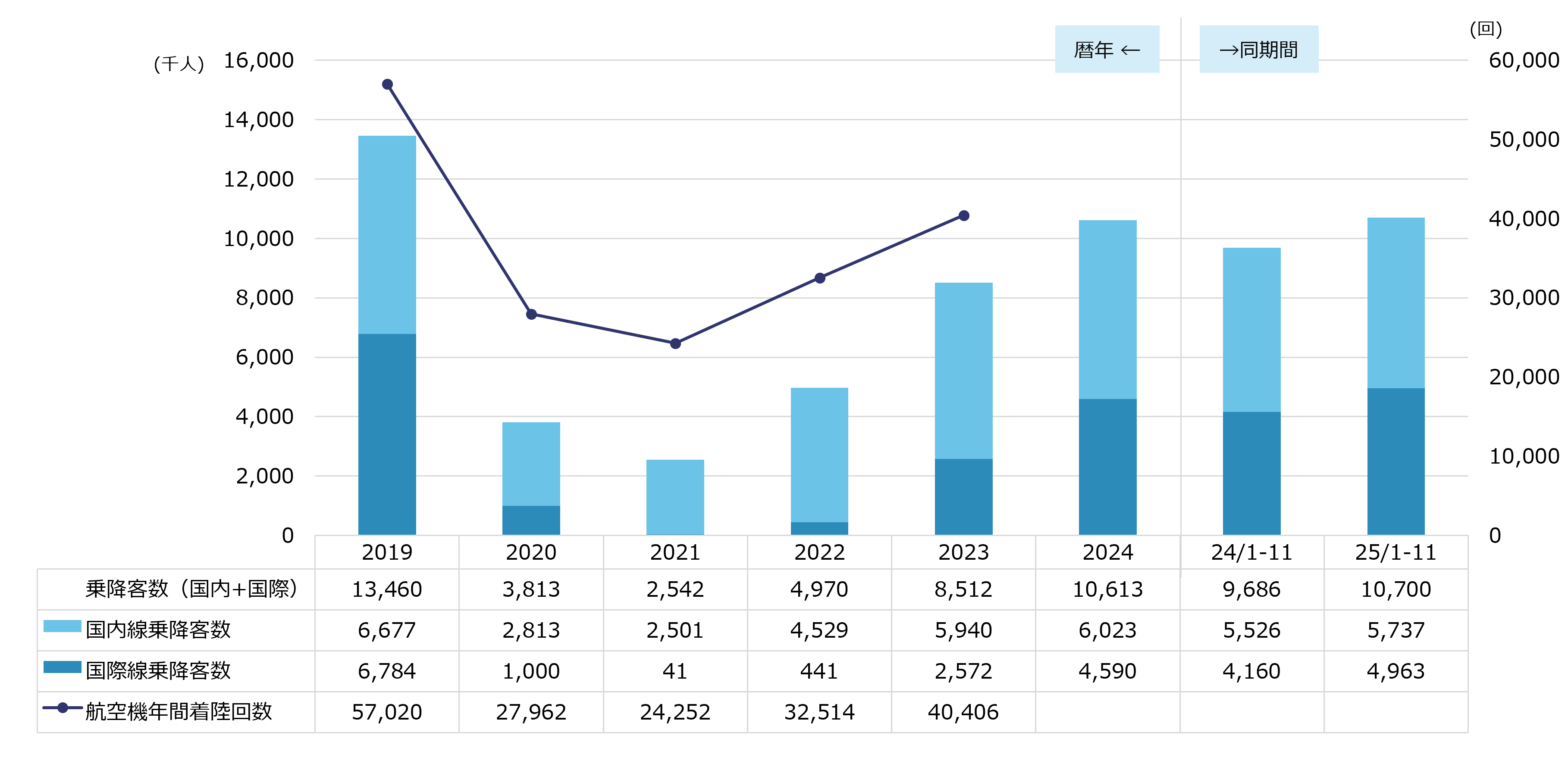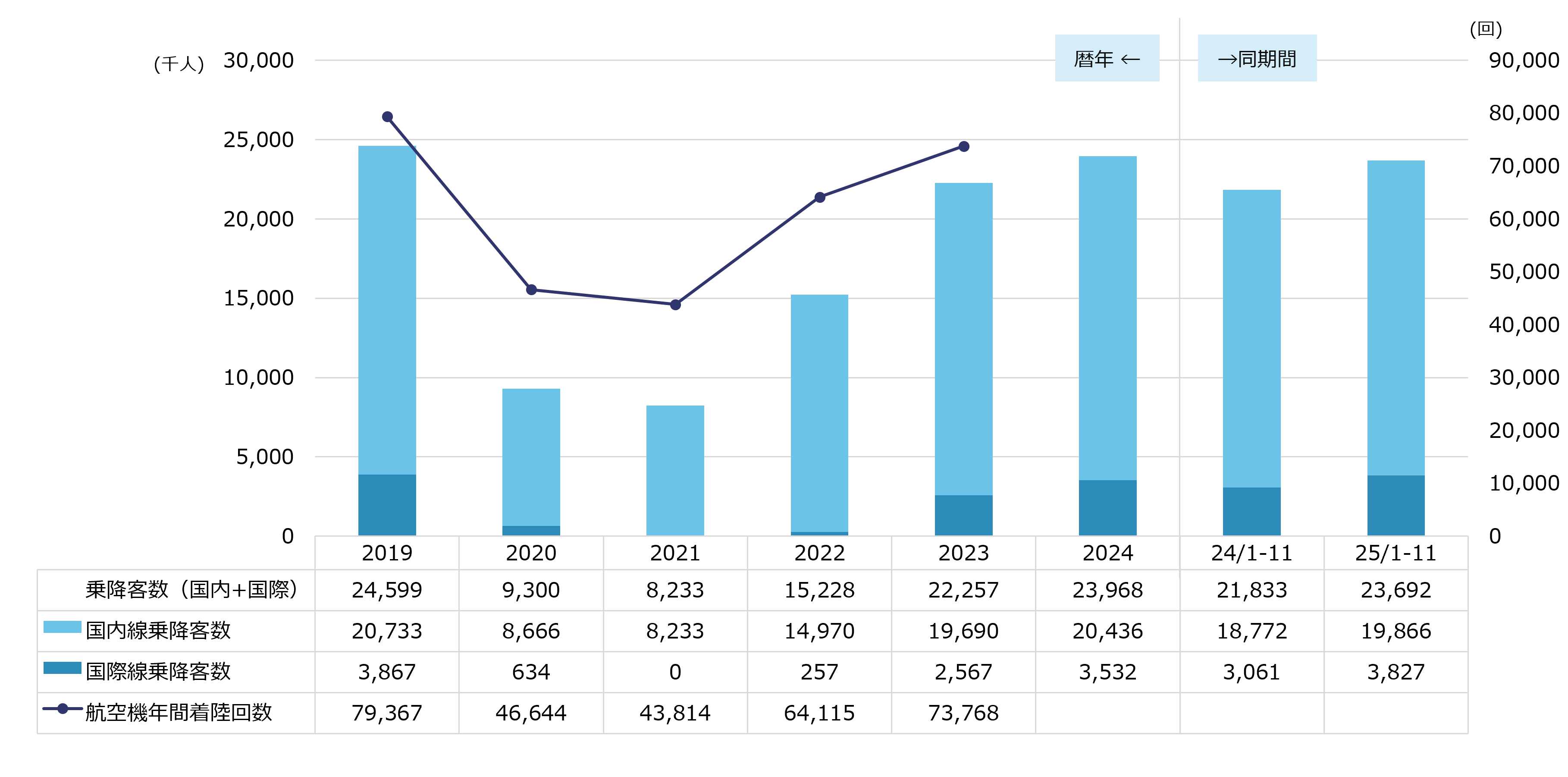 ※出典:2023年までは国土交通省「空港管理状況調書」、2024、2025年は大阪航空局「管内空港の利用概況集計表」